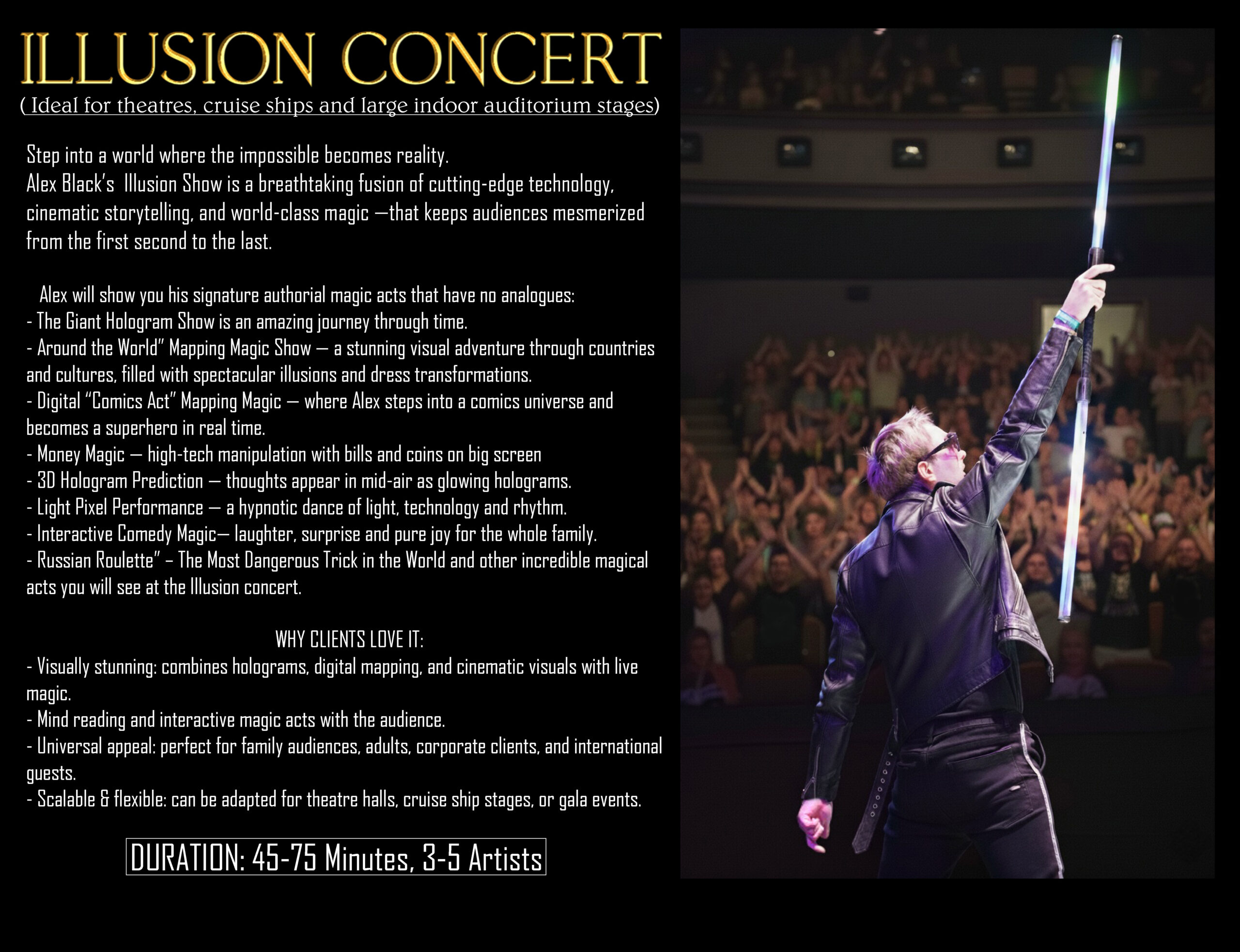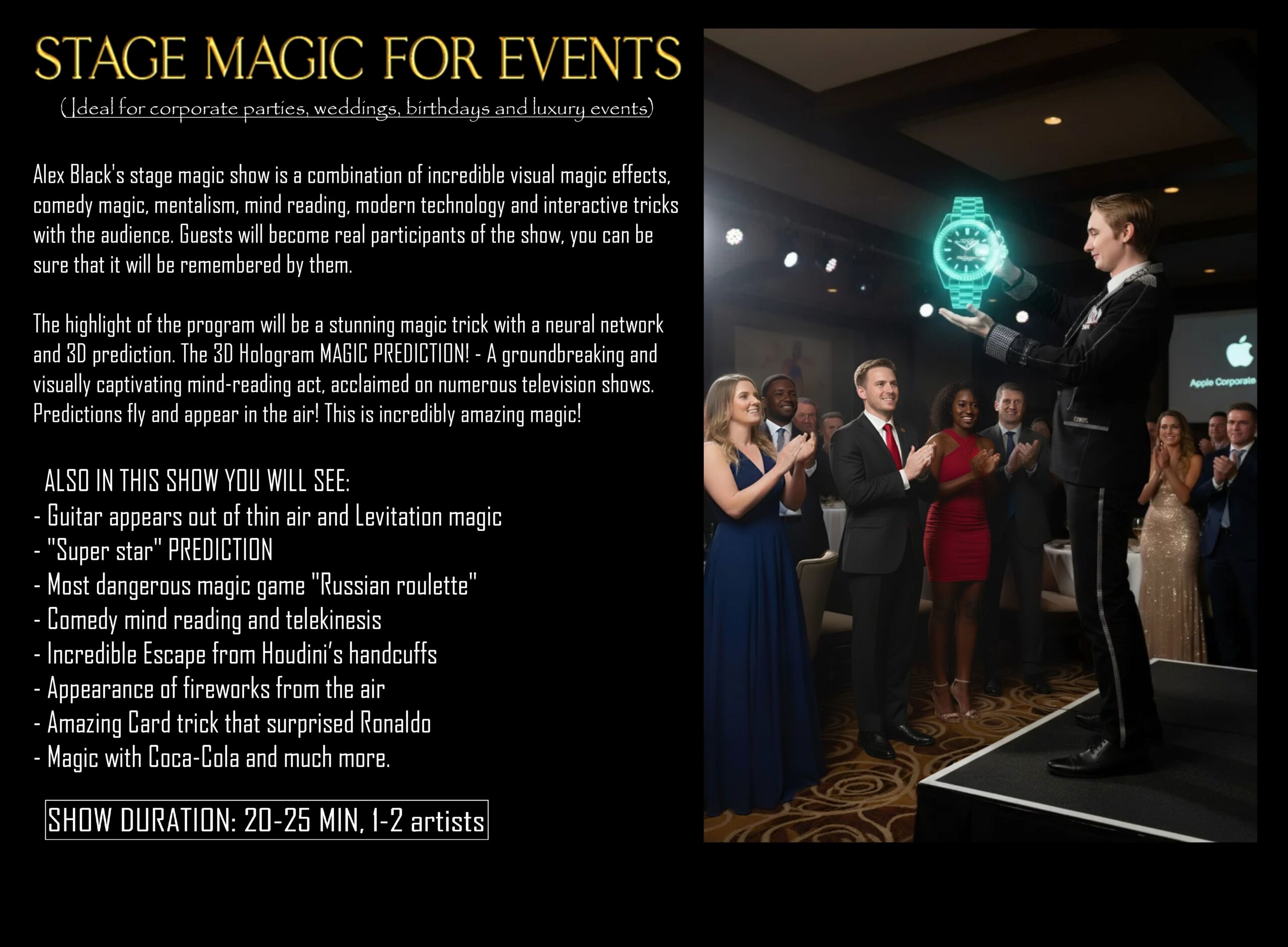 Illusionist interacts with the screen performing magic tricks. He turn movie pictures into real objects. There is an interaction between the artist, the big screen and the projector, this is an innovative magical act. Alex also came up with a new way to transform dresses magic that no one else in the world does! This magical act is loved by children and adults. If you are looking for modern volumetric magic, then this is the act for you.